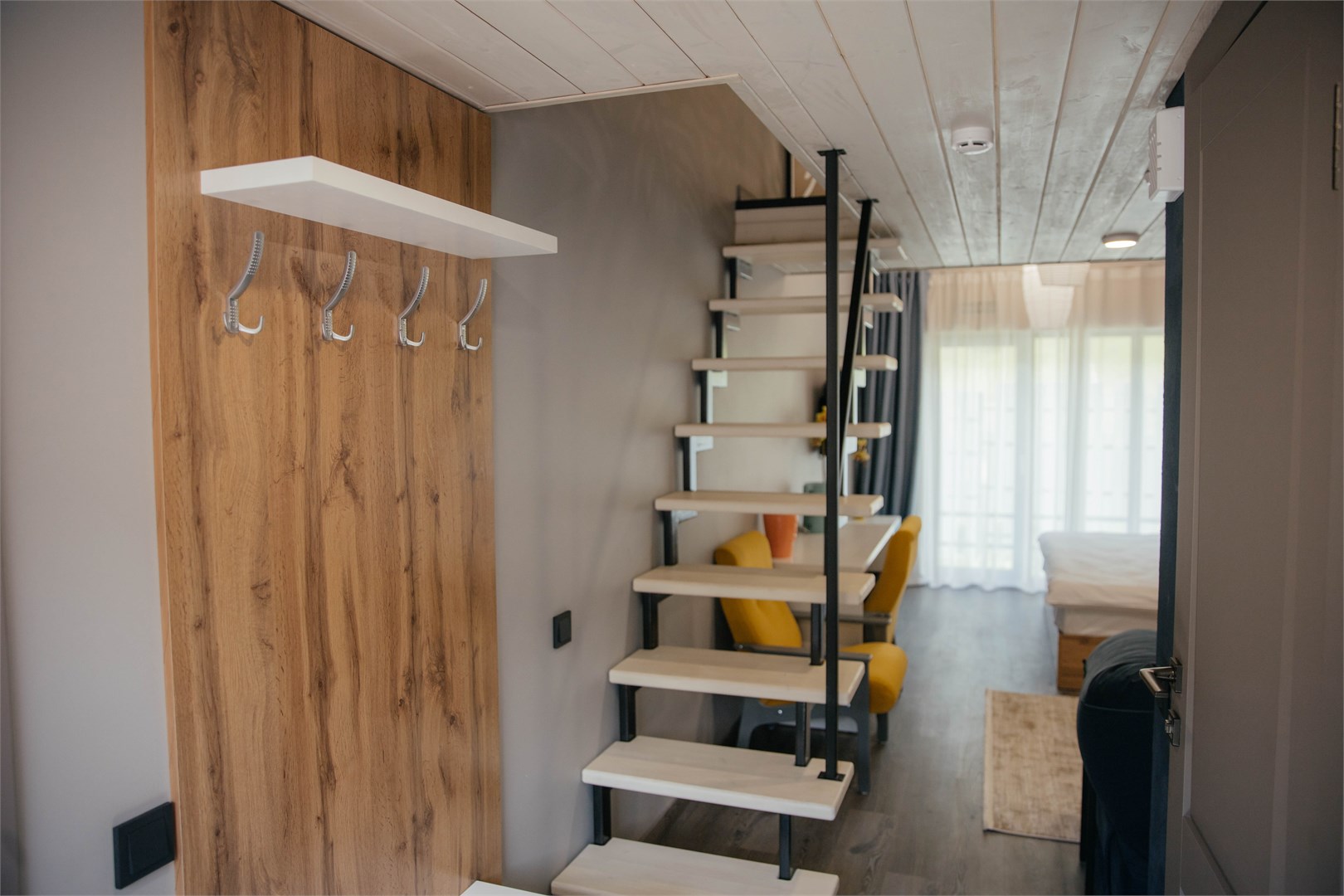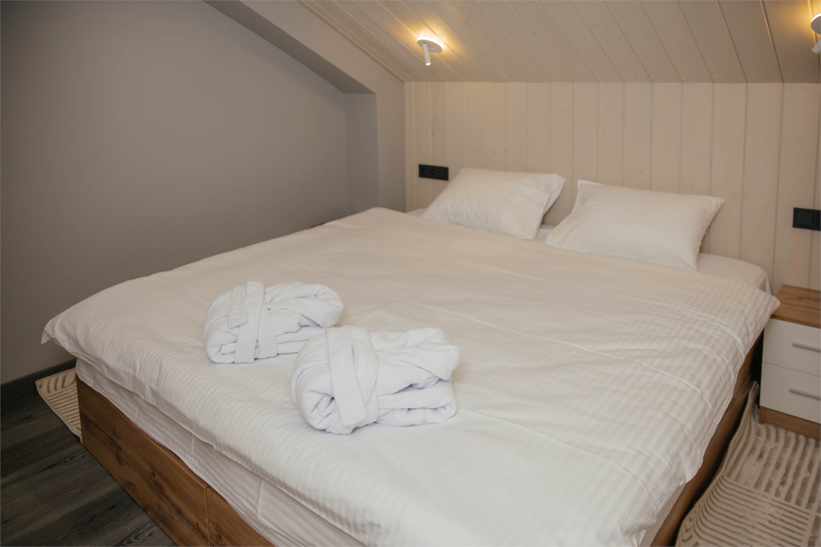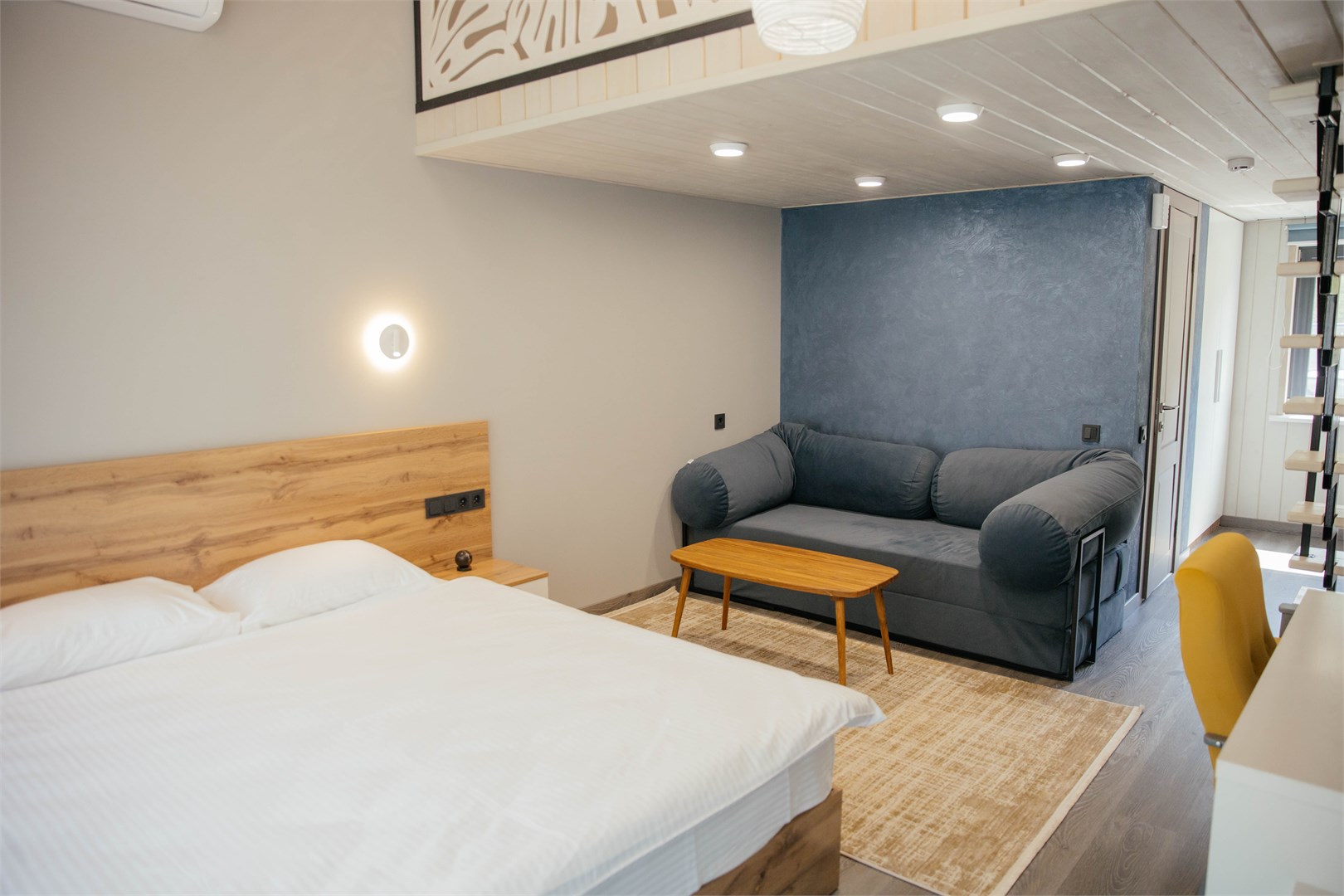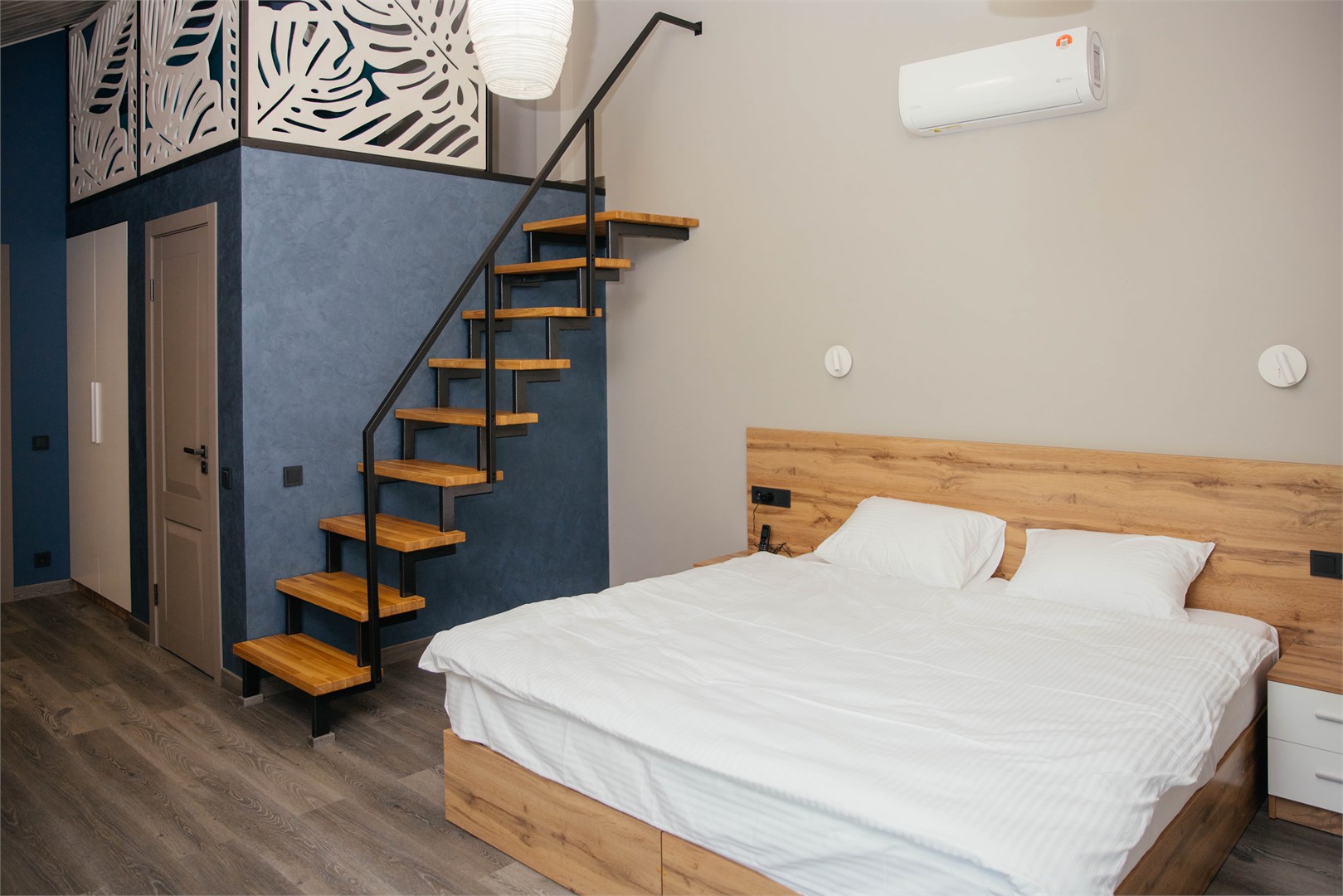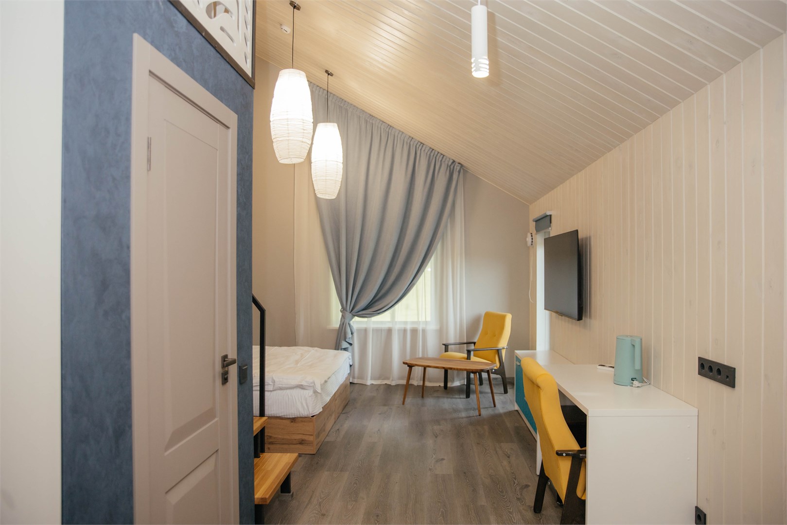 | Джуниор сюит Двухуровневый до 5 мест | 35 кв.м. | 5 чел. | Мебель (диван, кровать двуспальная, прикроватные тумбочки, стол, стулья, шкаф), Оборудование (гладил... | |